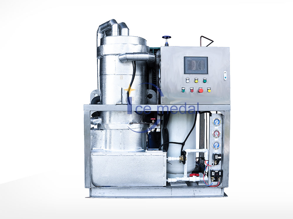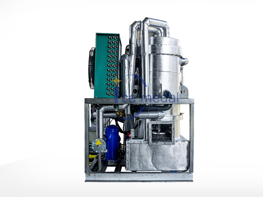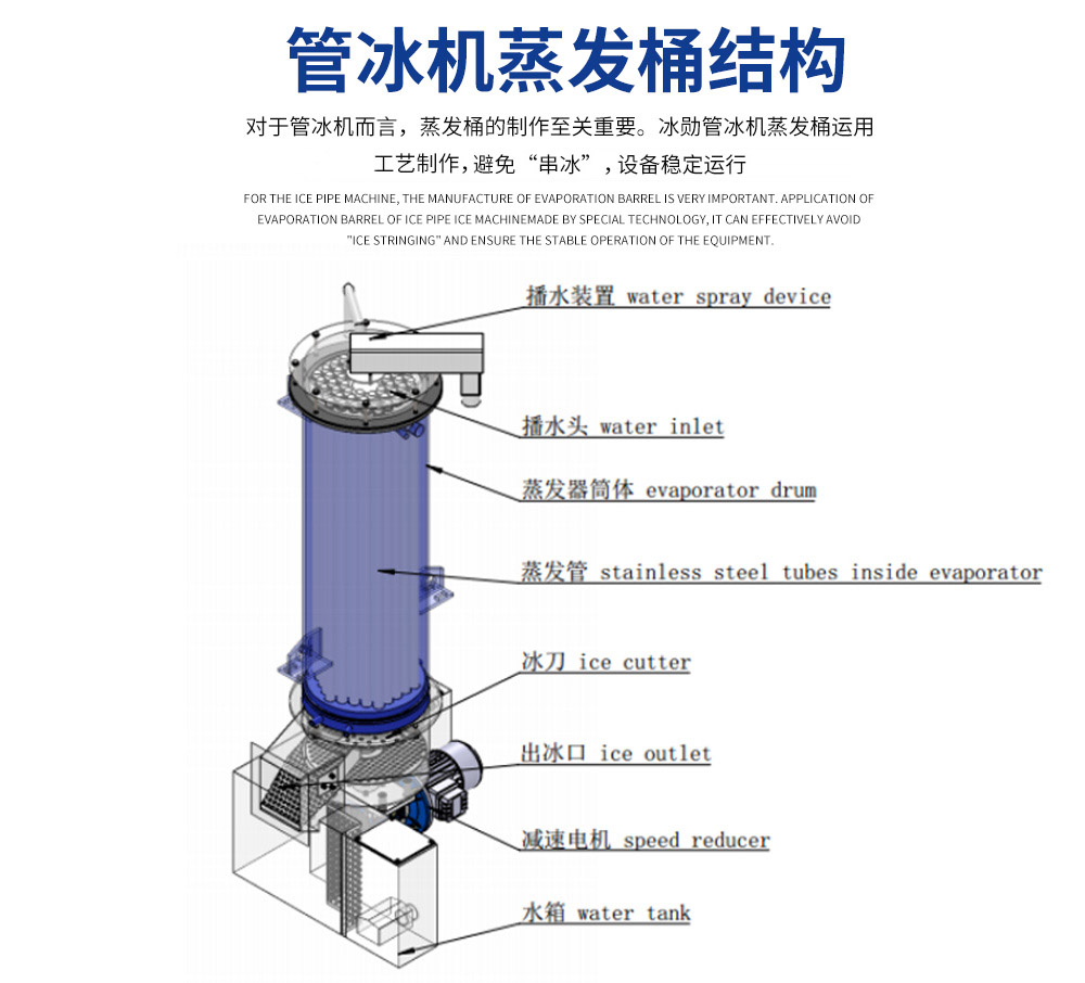 2、管冰机所有与制冰水接触部分材质均是食用级材料。 由多根不锈钢管组成蒸发器制冷剂在管与管之间流动,水在管内从上往下在分水器的作用下呈螺旋状流动, 水在流动过程中形成冰。