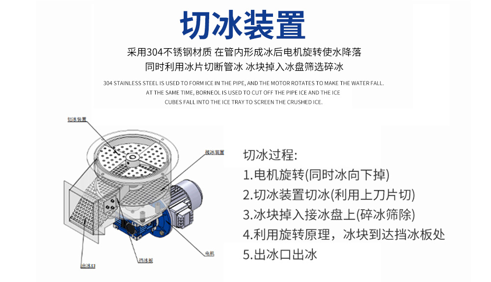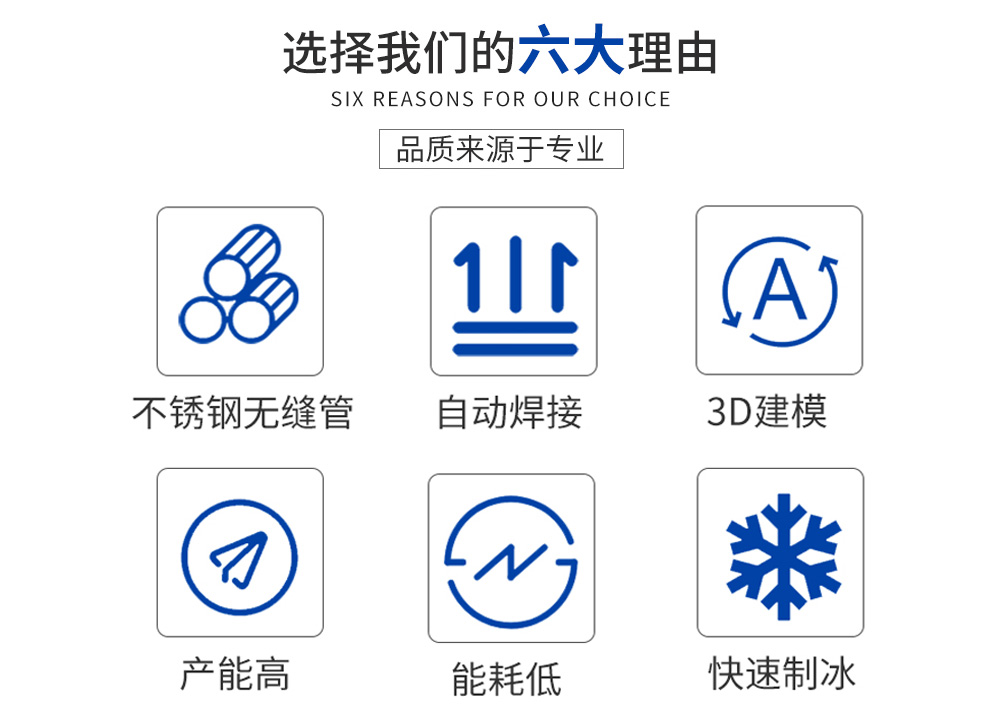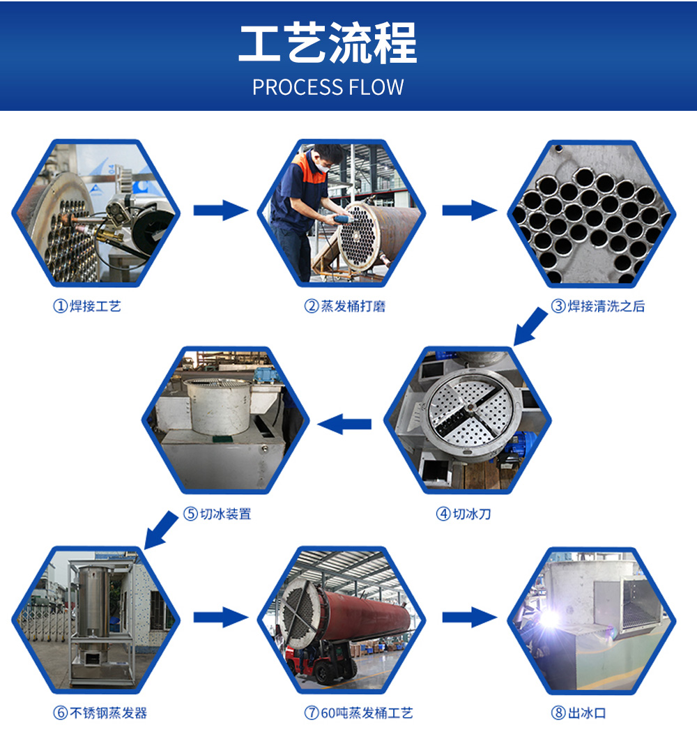 2、管冰机所有与制冰水接触部分材质均是食用级材料。 由多根不锈钢管组成蒸发器制冷剂在管与管之间流动,水在管内从上往下在分水器的作用下呈螺旋状流动, 水在流动过程中形成冰。