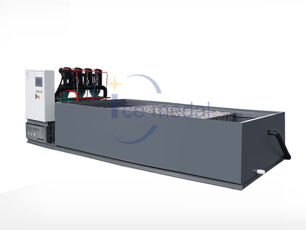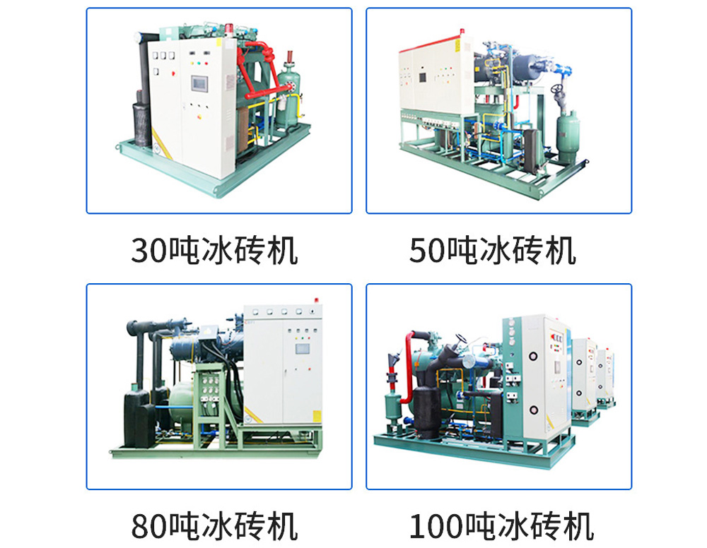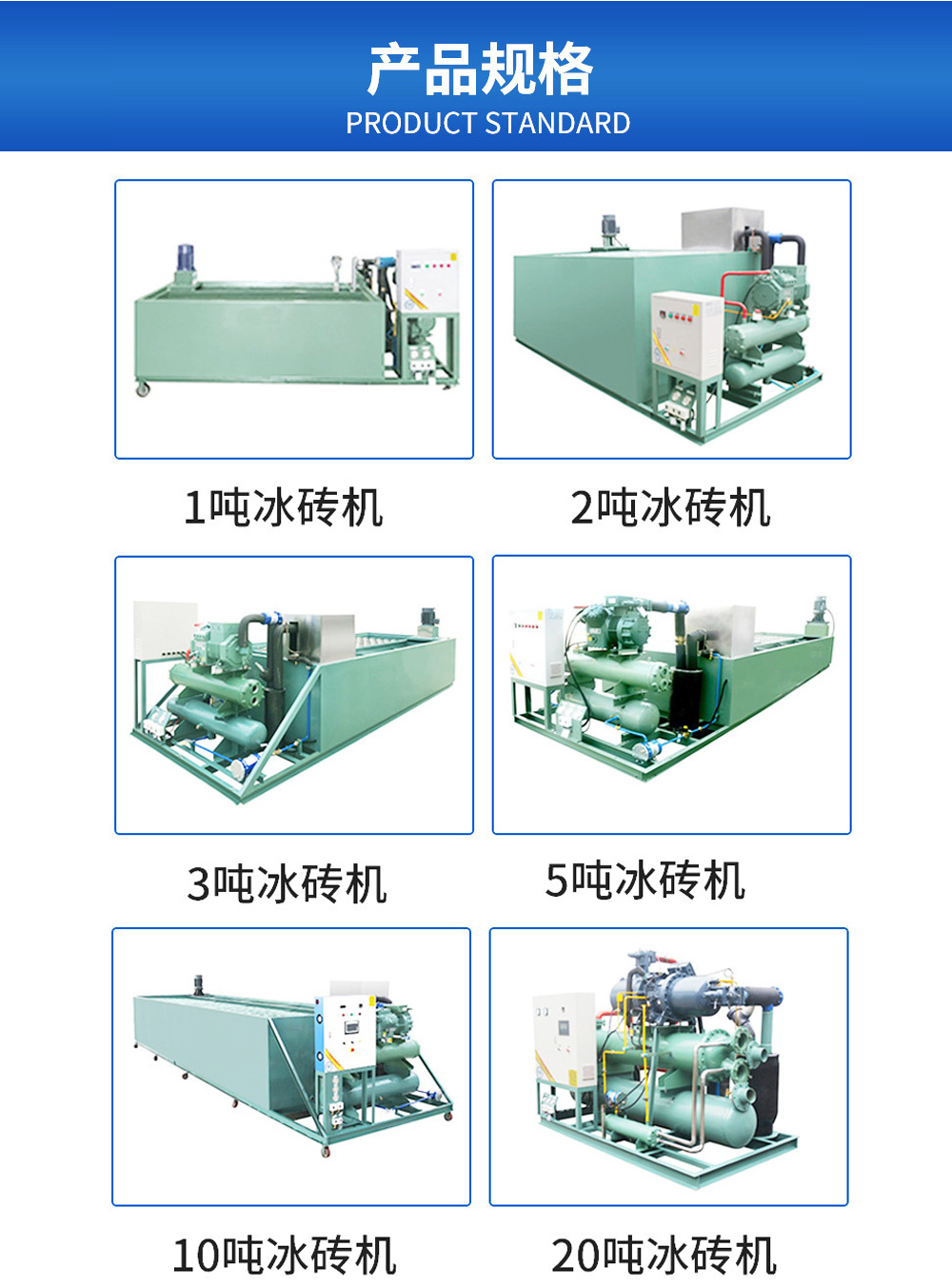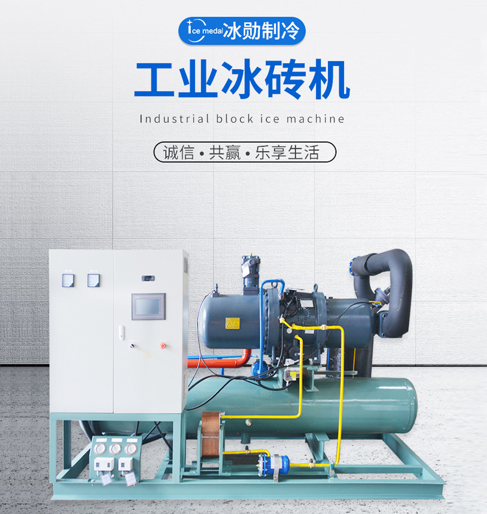 块冰机又名冰砖机,是制冰机中的一种,可分为直冷式块冰机、盐水式块冰机、直冷集装箱式块冰机、盐水制冰集装箱式块冰机。所制出的冰块是冰类产品中外形尺寸大,与外界的接触面积小,不容易融化。可根据不同要求粉碎成各种形式的冰块。适用于冰雕、混凝土降温、隧道降温制冰机、冰块储存海运、海上捕捞等。 粉碎后可以用于所有用冰的场所。但冰经过粉碎后,会部分融化,冰量损耗。冰块可以分为透明冰块、乳白色冰块和彩色冰块。块冰的尺寸可根据冰桶的大小进行定制。