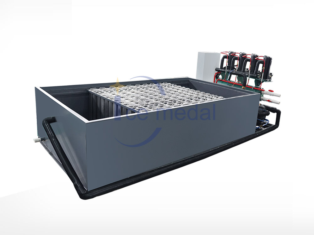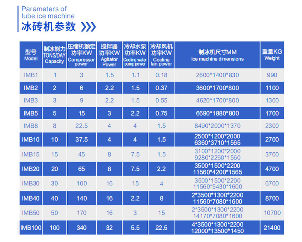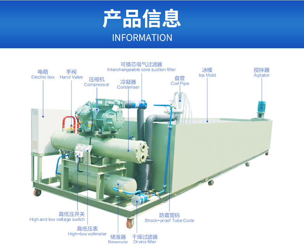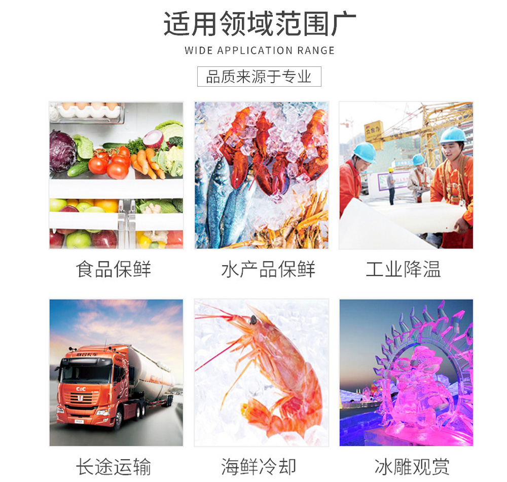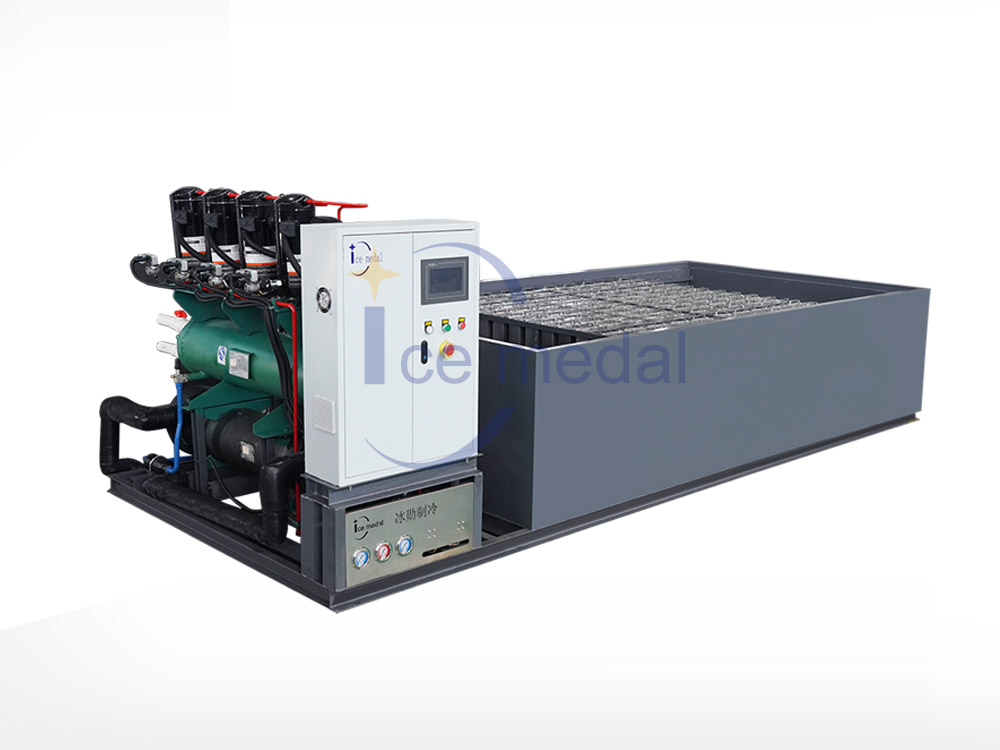 块冰机又名冰砖机,是制冰机中的一种,可分为直冷式块冰机、盐水式块冰机、直冷集装箱式块冰机、盐水制冰集装箱式块冰机。所制出的冰块是冰类产品中外形尺寸大,与外界的接触面积小,不容易融化。可根据不同要求粉碎成各种形式的冰块。适用于冰雕、混凝土降温、隧道降温制冰机、冰块储存海运、海上捕捞等。 粉碎后可以用于所有用冰的场所。但冰经过粉碎后,会部分融化,冰量损耗。冰块可以分为透明冰块、乳白色冰块和彩色冰块。块冰的尺寸可根据冰桶的大小进行定制。