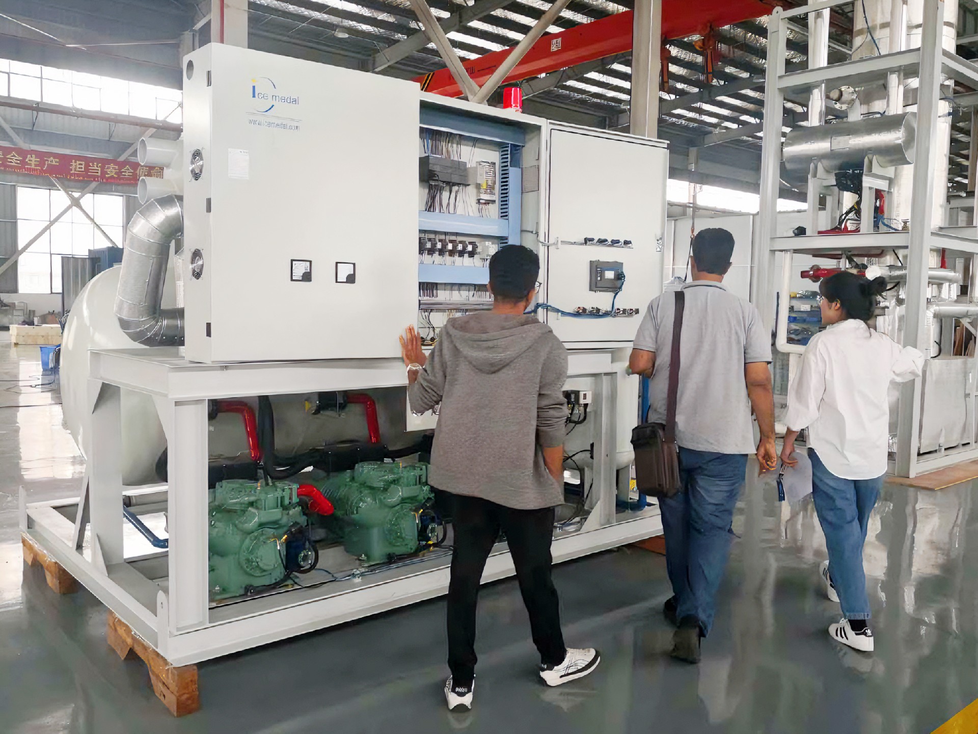 09月28日上午,两位来自阿曼的客户到访上海风暴娱乐制冷设备有限公司进行实地参观考察。公司总经理鲁岳雷先生给与了热情招待,在鲁总等部门负责人的陪同下,客户参观了刚刚搬迁新址的8000m2工厂并深入了解了风暴娱乐在制冰制冷技术方面的创新和生产过程。